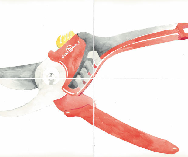 C’est avec le couteau que tout à commencé, je l’ai utilisé pour couper l’image, pour la déconstruire, en le photographiant. J’ai ensuite continué à couper uniquement par le cadrage photographique : je coupais pour ainsi dire les images... Puis la photo n'était plus suffisante à mes yeux. Elle ne me permettait plus d'exprimer suffisamment mes idées. Je me suis tournée alors vers d'autres moyens d'expression et l’objet couteau est réapparu comme une injonction. J’avais une furieuse envie de dessiner des lames, des objets tranchants de toutes sortes : sécateurs, couteaux, scies, tronçonneuses... Le dessin n’était pas pour autant particulièrement agressif mais le symbole restait comme nous l’a asséné Freud sans doute un peu phallique.